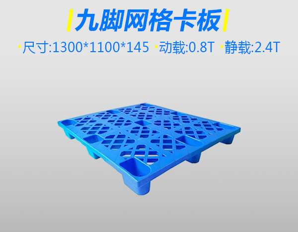 單面九腳網(wǎng)格板:采用以低壓高密度聚乙烯為主要原料,是包裝行業(yè)的新產(chǎn)品,搬運(yùn)倉(cāng)儲(chǔ)的好助手,與鋼托盤、木托盤相比塑膠卡板具有質(zhì)輕、平整、美觀。整體性好、無釘無刺、無味無毒、耐酸堿、易清洗、能消毒、不霉?fàn)€、不助燃、無靜電、無火花、防爆、防滑溜(裝有防滑墊)、可回收等優(yōu)點(diǎn),塑膠卡板使用壽命是木托盤的5-7倍,是現(xiàn)代化運(yùn)輸、包裝、倉(cāng)儲(chǔ)的重要工具,是國(guó)際上規(guī)定的用于食品、水產(chǎn)品、醫(yī)藥、化學(xué)品等包裝器材的優(yōu)選產(chǎn)品。